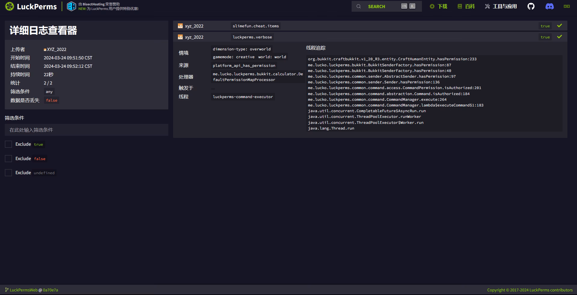 lp verbose on !Luck & !anticheatLuck & (essentials | worldedit)- 匹配 'essentials'和'worldedit' 开头的权限检查。!Luck & !anticheat- 匹配除了 'Luck' 和 'anticheat' 开头以外的权限检查。anticheat & !anticheat.check- 匹配以'anticheat' 开头 但不匹配 'anticheat.check' 开头的权限检查。